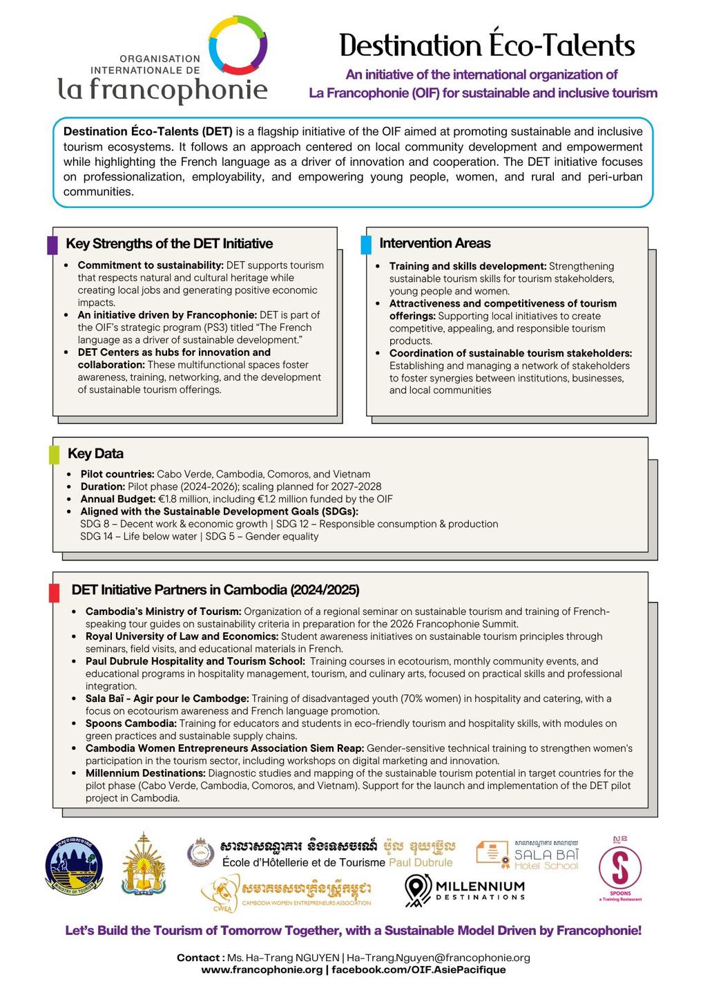 Read Moreអង្គការអន្តរជាតិនៃភាសាបារាំង (OIF) និងក្រសួងទេសចរណ៍កម្ពុជា បានបើកវគ្គបណ្តុះបណ្តាលឡើងវិញសម្រាប់មគ្គុទ្ទេសក៍ទេសចរណ៍ដែលនិយាយភាសាបារាំងនៅខេត្តសៀមរាប ចាប់ពីថ្ងៃទី ២១ ដល់ថ្ងៃទី ២៣ ខែកក្កដា ឆ្នាំ ២០២៥។ កម្មវិធីនេះ ដែលមានមគ្គុទ្ទេសក៍ប្រមាណមួយរយនាក់ចូលរួមក្នុងរយៈពេលបីវគ្គ មានគោលបំណងបង្កើនជំនាញភាសាបារាំងរបស់ពួកគេ ក្នុងការរំពឹងទុកនៃកិច្ចប្រជុំកំពូលភាសាបារាំងឆ្នាំ ២០២៦។ គំនិតផ្តួចផ្តើមនេះ ស្របនឹងគោលដៅរបស់ក្រសួងក្នុងការលើកកម្ពស់ស្តង់ដារសេវាកម្ម និងការផ្តោតអារម្មណ៍របស់ OIF លើវិស័យទេសចរណ៍ប្រកបដោយចីរភាព និងលទ្ធភាពការងារសម្រាប់យុវជន និងស្ត្រី។ មន្ត្រីនានាបានបញ្ជាក់ពីសារៈសំខាន់នៃការបណ្តុះបណ្តាលនេះ ជាពិសេសសម្រាប់ខេត្តដែលមានភ្ញៀវទេសចរបារាំងមួយចំនួនធំ។